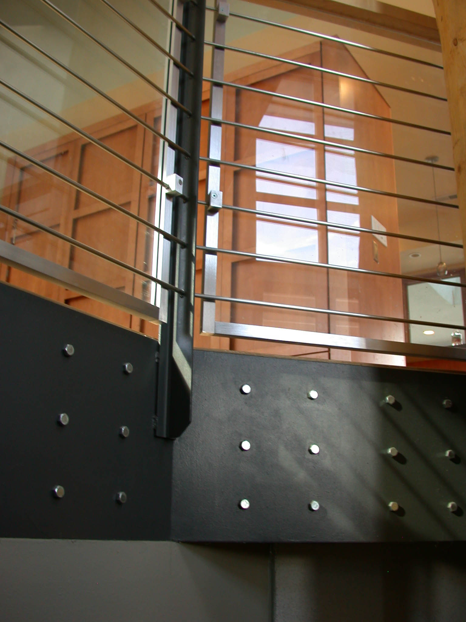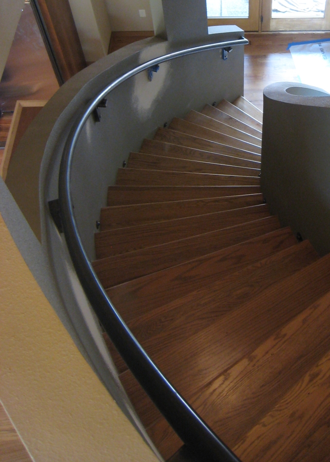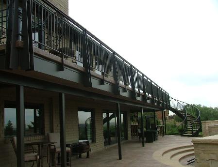 | Colorado Springs, CO - This home in the Cheyenne Mountain Resort area of Colorado Springs was completely gutted and updated with a contemporary style to serve as the homeowners' retirement home. We constructed a steel canopy structure in the front of the home and a steel-supported deck in the back of the home that stretches 70 feet. Because the home was already landscaped and fenced, there was not any way to drive a vehicle or lift to the back side of the home. The deck and staircase had to be built in our shop in pieces, and then carried by hand from the driveway down a hill to the back of the home. The pieces then had to be hoisted by hand and assembled on the job site. Much of the job, including the radiused stair railing, was required to be built on site piece by piece. Click here for more photos. |